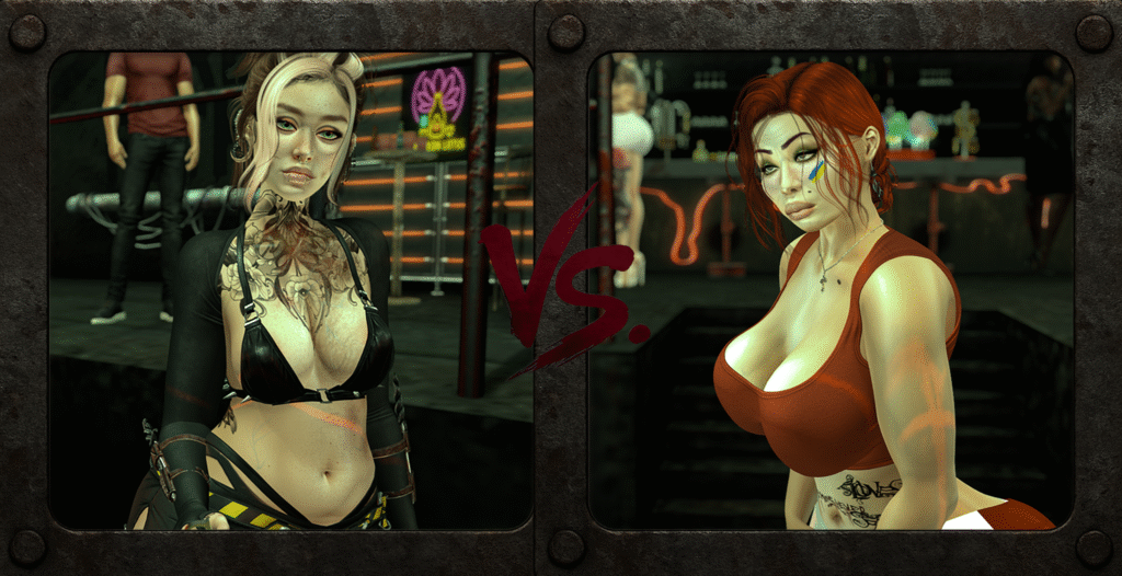 The final bout of the evening brought two ice-cold forces into collision: Eira, fierce and relentless, and Ingrid, the towering bruiser with a reputation for ending fights early. Bound with a leather strap and drugged blades neither women were leaving the ring until their scores were settled. Ingrid opened strong while kicking Eira in the knee and gaining first blood with a little extra something left behind. Between body blows, strap-winding, and the sharp sting of blades kissing skin both women were in it to win. In a final strategic move from Eira, the strap became a choke-hold that didn’t relent until Ingrid submitted to the shadows.